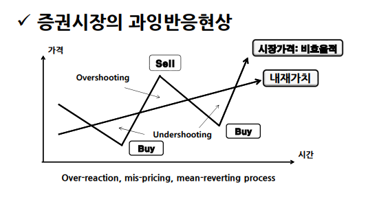 3.평균반전현상(Mean-Reverting) 단기적으로 비효율적이나, 장기적으로 효율적이므로 결국 평균반전된다는 의미