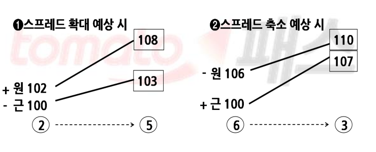 강세스프레드(스프레드 축소) : 강세장. 근월물이 상승. 약세장 .근월물이 적게 하락 (근월물 매수, 원월물 매도)
