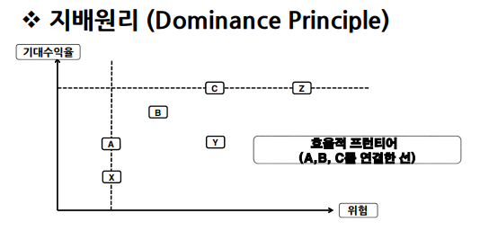 효율적투자기회선 : 여러개의 효율적 포트폴리오를 수익률과 위험의 공간에서 연속적으로 연결함.