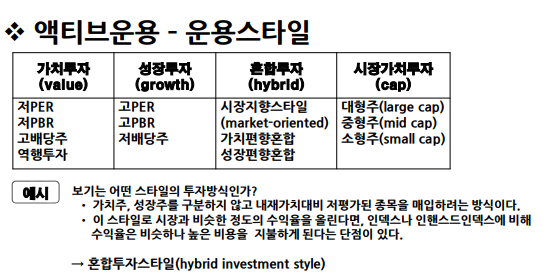 -인덱스 초과수익률, 적극적 인덱스 투자. 펀드메니저는 정해진 스타일 내에서 투자. 자산배분은 펀드 밖에서